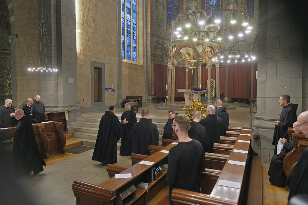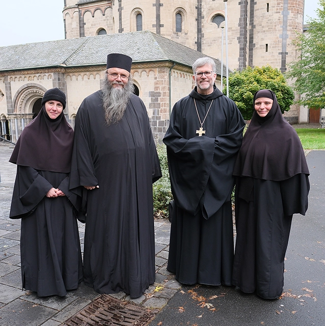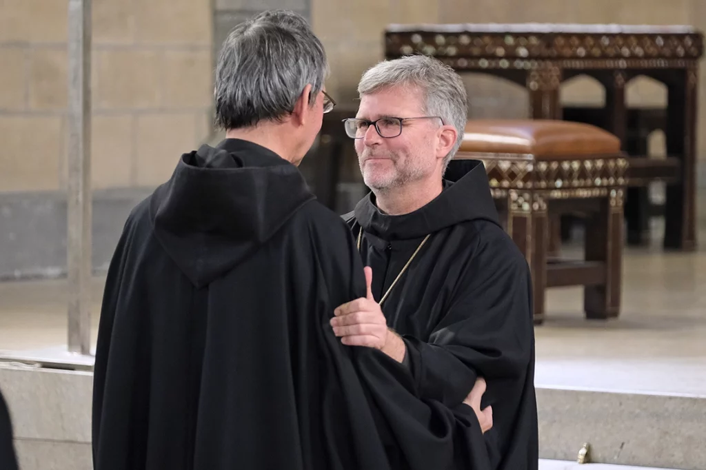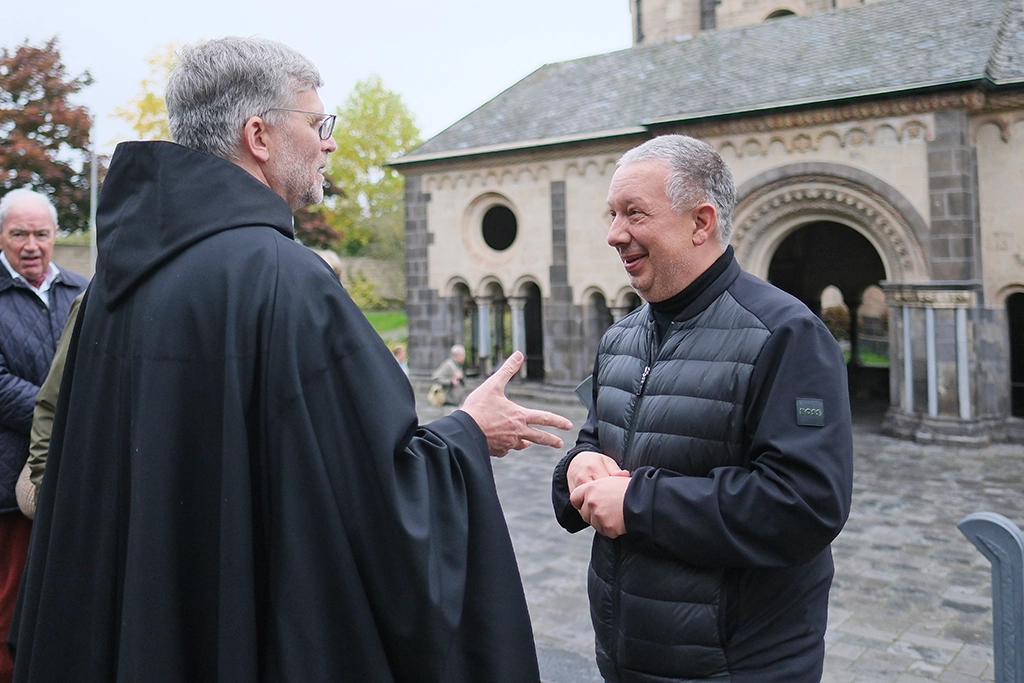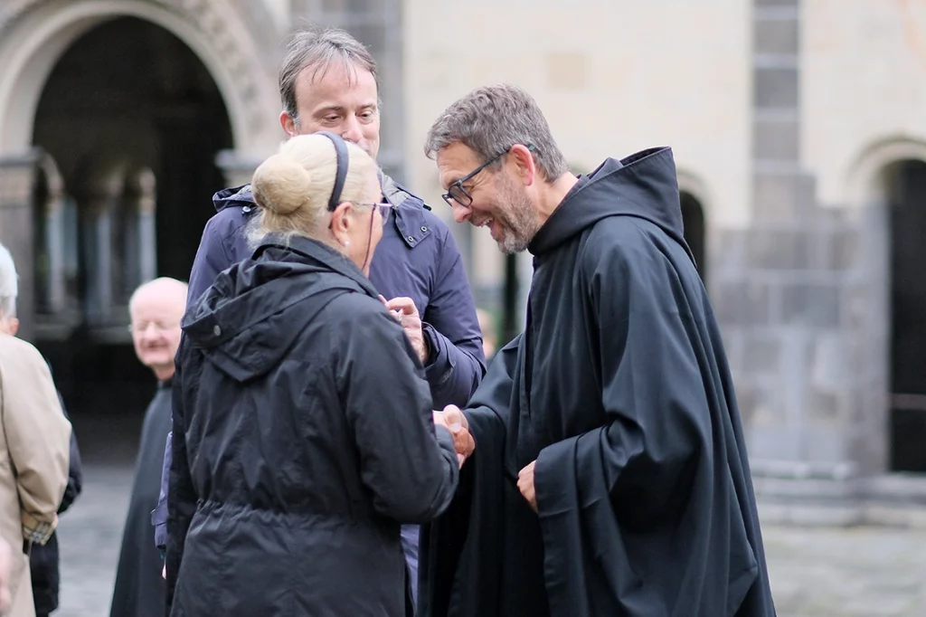Die Mönche von Maria Laach nahmen Abt Mauritius und Prior Maximilian mit einem symbolischen Friedensgruß in ihre Gemeinschaft auf. Die fast 250 Mitarbeiterinnen und Mitarbeiter der Abtei sowie Freunde und Mitglieder der Kloster-Gremien hatten Gelegenheit, bei diesem Ereignis dabei zu sein. P. Mauritius erteilte allen erstmals den Segen als Abt. Die am Freitag (3.10.) im Vatikan verkündete Personalentscheidung war in Maria Laach mit großer Erleichterung aufgenommen und gefeiert worden. Sie löste auch im Ausland positive Reaktionen aus: So haben zahlreiche Gratulanten – zum Beispiel aus Italien, Österreich, den Philippinen und den USA – Glück- und Segenswünsche für den neuen Abt und seine Gemeinschaft der Mönche nach Maria Laach geschickt.