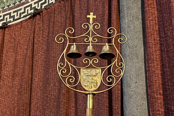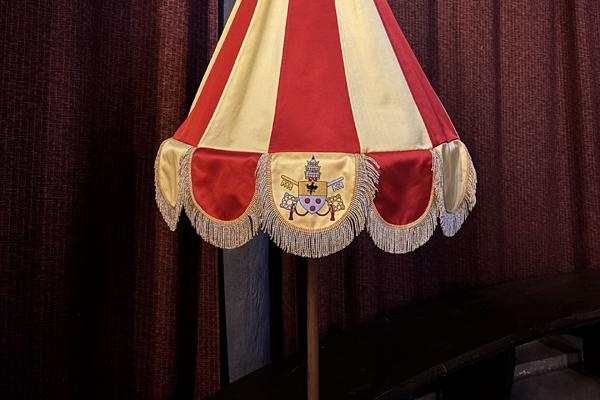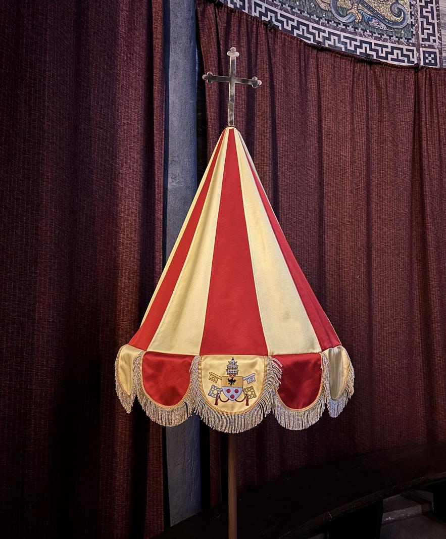 Die Ehrenzeichen, die eine Basilica Minor auszeichnen, erscheinen in unserer Kirche wieder in neuem Glanz: das Conopeum, ein Schirm in den päpstlichen Farben Purpur und Gold, und der Schellenbaum.