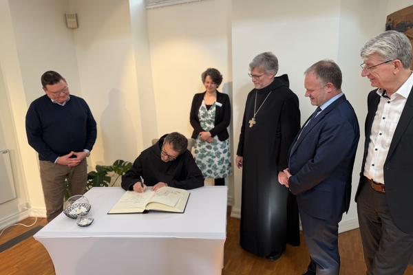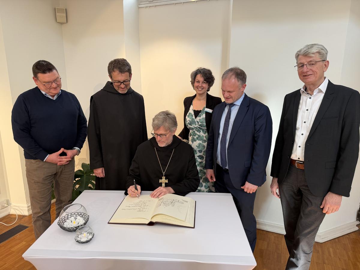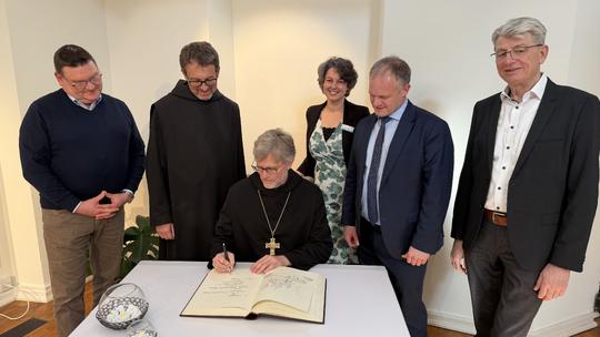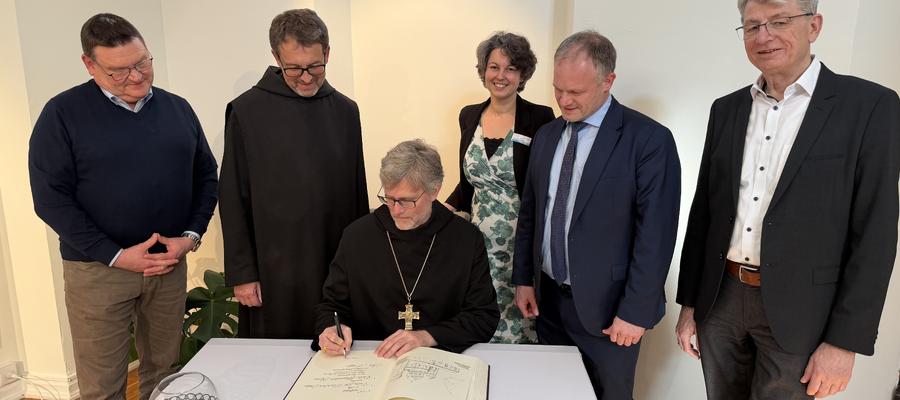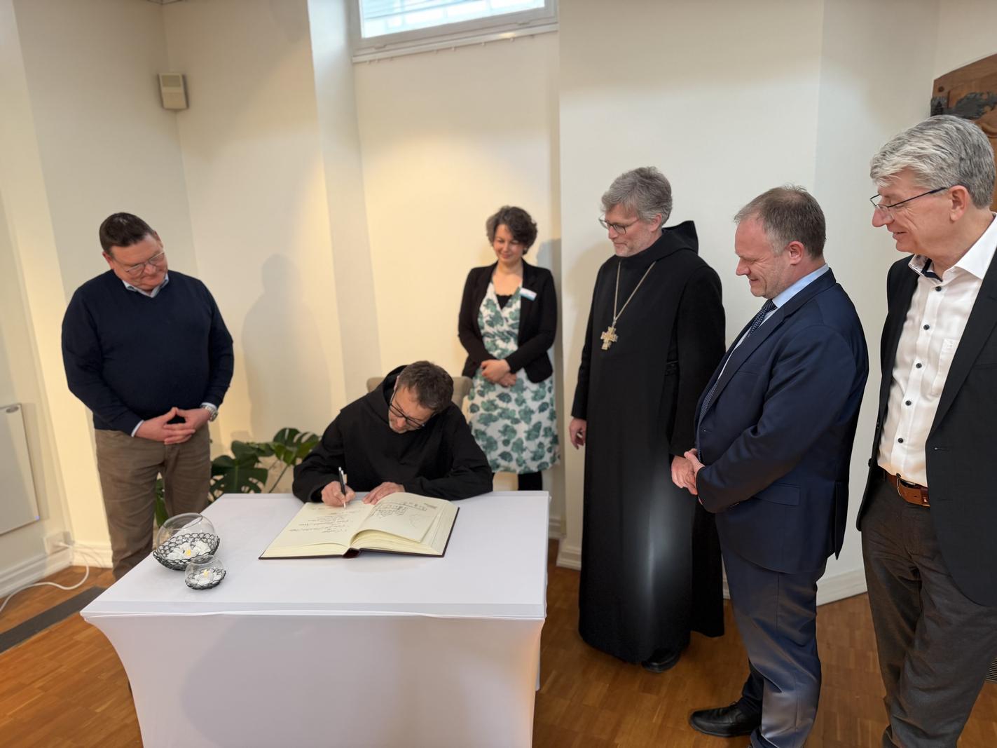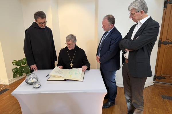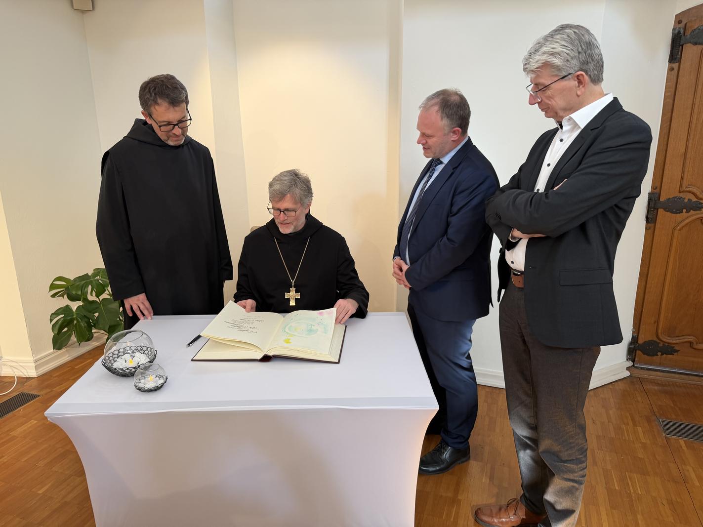 Abt Dr. Mauritius Wilde und Prior Maximilian Krenn waren zu Besuch in Neuwied und wurden dort von Oberbürgermeister Jan Einig empfangen. Im Rahmen ihres Aufenthalts trugen sie sich in das Buch der Stadt Neuwied ein.