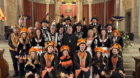Am Sonntag durfte die Abtei Maria Laach das Prinzenpaar der KG Jeläse Jecke e. V. sowie rund 30 Vertreterinnen und Vertreter des Vereins in prächtigen Ornaten und Uniformen herzlich willkommen heißen. Gemeinsam feierte man den Gottesdienst und kam anschließend in einer offenen und persönlichen Runde miteinander ins Gespräch.