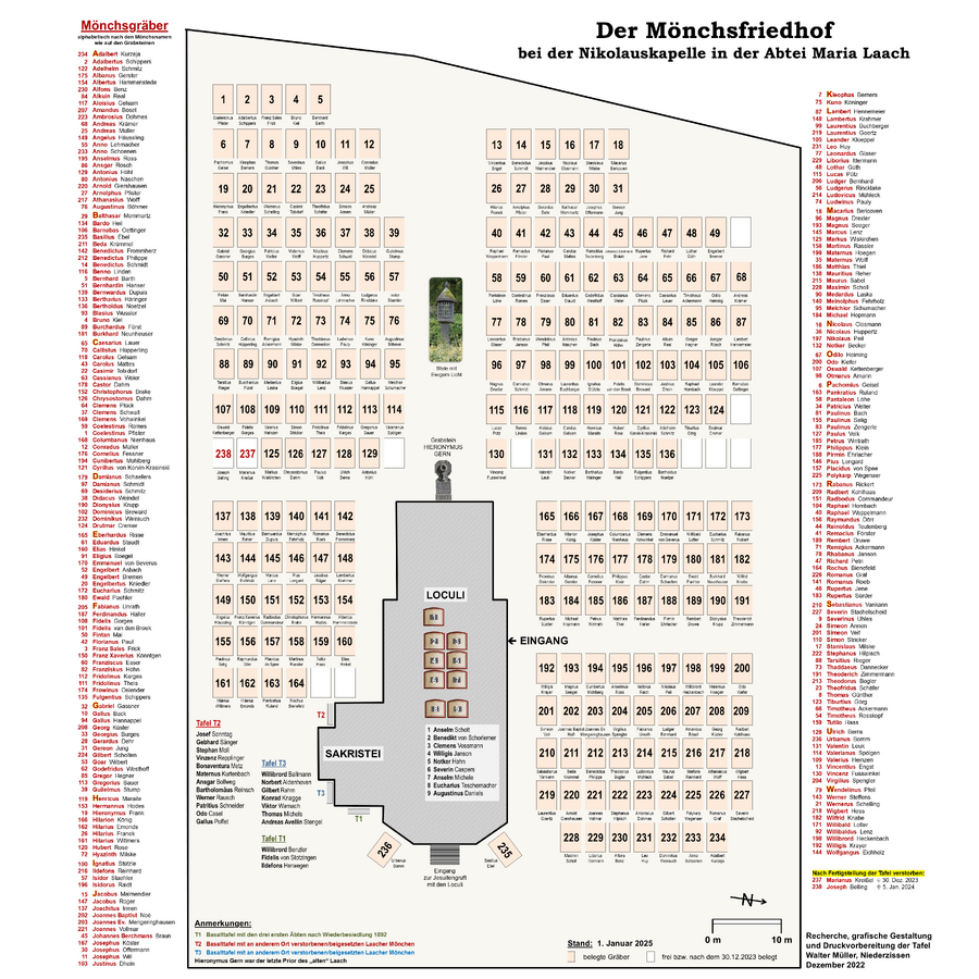Links und rechts reihen sich untereinander die hier beigesetzten Mönche, alphabetisch geordnet nach ihrem Ordensnamen, ergänzt um die Nummer ihrer jeweiligen Grabstätte. Mit einem Blick findet nun der Besucher das „gewünschte“ Grab und kann es auf kurzem und direktem Wege gezielt für ein Gebet aufsuchen.