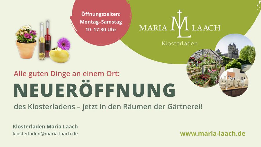 Mit der Zusammenlegung des bisherigen Kloster-Ladens und der Klostergärtnerei wurde eine hochwertige Erweiterung des Angebotes geschaffen, die den Besuchern Maria Laachs nun ein einmaliges Einkaufserlebnis unter einem Dach – natürlich barrierefrei zugänglich – ermöglicht.