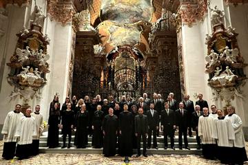Sodann folgte am Dienstag, dem 15. Oktober, der Tag, auf den die Cappella so lange hin fieberte: das festliche Jubiläumskonzert „30 Jahre Mauritius-Orgel in Einsiedeln“ mit besonders ausgewähltem Programm, namentlich der „Messe Solennelle“ für Chor und zwei Orgeln op. 16 von Louis Vierne, dem „Magnificat“ von Jean-Charles Gandrille, der Messe für zwei Chöre und zwei Orgeln op. 36 von Charles-Marie Widor und dem „Te Deum“ für Chor, Tenor-Solo, Bläser und zwei Orgeln von Pater Theo Flury OSB, Mönch der Abtei Einsiedeln. Beim Schlussapplaus der sichtlich begeisterten Konzertbesucher war es ein sehr berührender Moment, alle Beteiligten, voran Pater Philipp und Pater Theo, Organist Johannes Trümpler, Tenorsolist Daniel Tilch und die Bläser des Neuen Rheinischen Kammerorchesters Köln, sich Hand in Hand verbeugend zu sehen – ein Zeichen der gemeinschaftlichen Leistung und im Besonderen der tiefen freundschaftlichen Verbundenheit der beiden Benediktinermönche, die sich seit dem Jahr 1999 kennen. Diese Verbindung führte überhaupt zur Projektidee der beiden Musiker, sodass das Konzertprogramm im August 2024 in Maria Laach erstmalig zur Aufführung kam – mit Pater Theo an der Laacher Schwalbennest-Orgel – und sogleich die Einladung erfolgte, ihn in „seinem“ Kloster zu besuchen und dort erneut gemeinsam zu musizieren. Anlass für das Konzertdatum in Einsiedeln war zudem der 30. „Weihetag“ der Mauritius-Orgel; zu deren Weihe im Jahr 1994 hatte Pater Theo einst sein „Te Deum“ komponiert. Er nahm sich neben der organisatorischen und künstlerischen Begleitung vor Ort auch die Zeit, die Gruppe durch das Kloster, insbesondere die Abteikirche, die sich daran anschließende Stiftsschule und durch die wunderschöne barocke Stiftsbibliothek zu führen. Dort zeigte Pater Theo nicht nur Faksimiles und Originale prachtvoller Inkunabeln und Handschriften, sondern ließ alle Interessierten auch teilhaben an seinem inspirierenden geistlichen und lebenserfahrenden Blick auf uns Menschen und unser Miteinander.