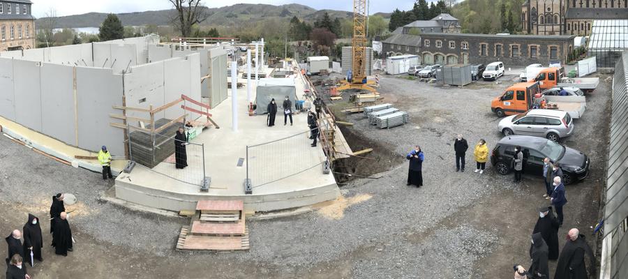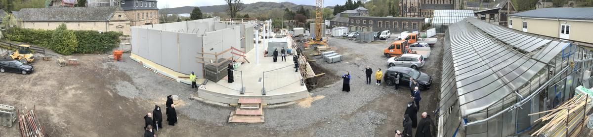 Seit der letzten Woche erheben sich hier die Wände der neuen Klostergaststätte. Über die Klausurmauer hinweg ist das entstehende Gebäude schon zu sehen. Heute sind wir zusammengekommen, um den Grundstein der Klostergaststätte zu legen. Es ist ein freudiger Anlass. Auch wenn Corona uns zwingt, die Feier nur im kleinen Rahmen abzuhalten.