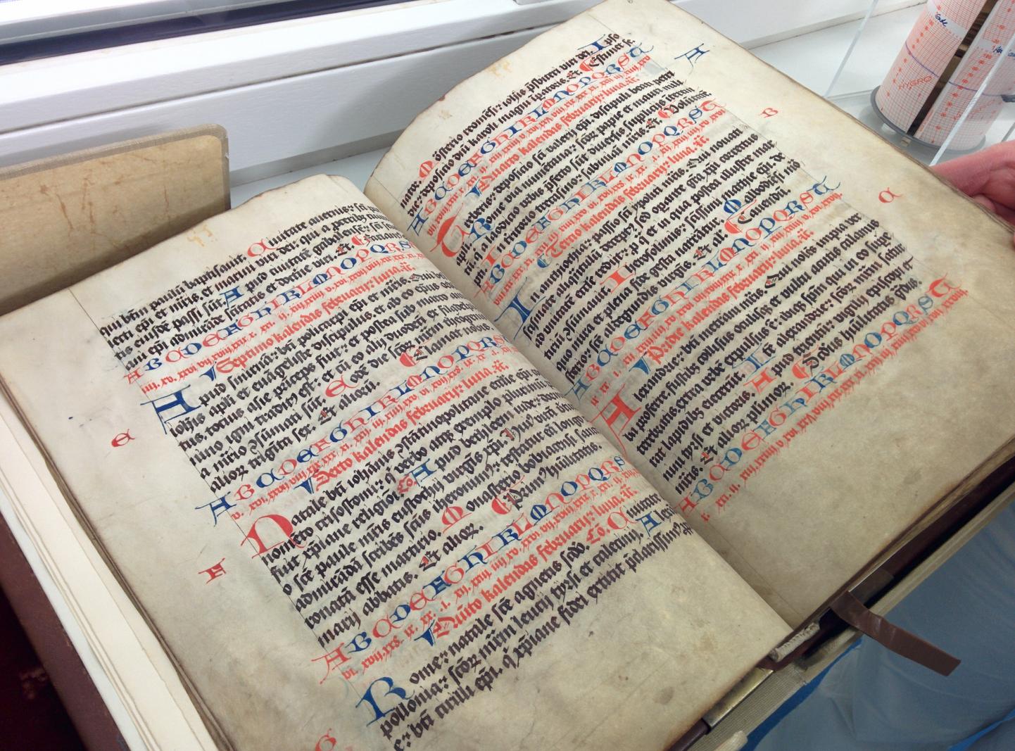 Der ältere Teil des Bestandes hat seinen Standort in der nach denkmalpflegerischen Gesichtspunkten restaurierten Jesuitenbibliothek behalten. Ausgenommen davon sind besonders alte und wertvolle Bände, die in einem gesicherten Rara-Magazin unter idealen klimatischen Bedingungen aufbewahrt werden. Die für den heutigen Konvent bedeutendste Handschrift aus der historischen Bibliothek ist das um 1500 entstandene Kapitelsbuch mit Martyrologium, Benediktinerregel und Laacher Nekrolog.