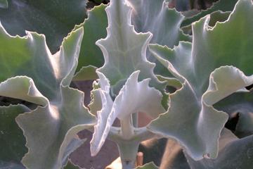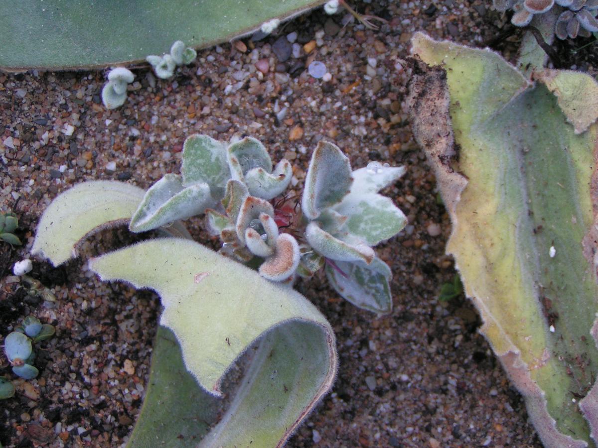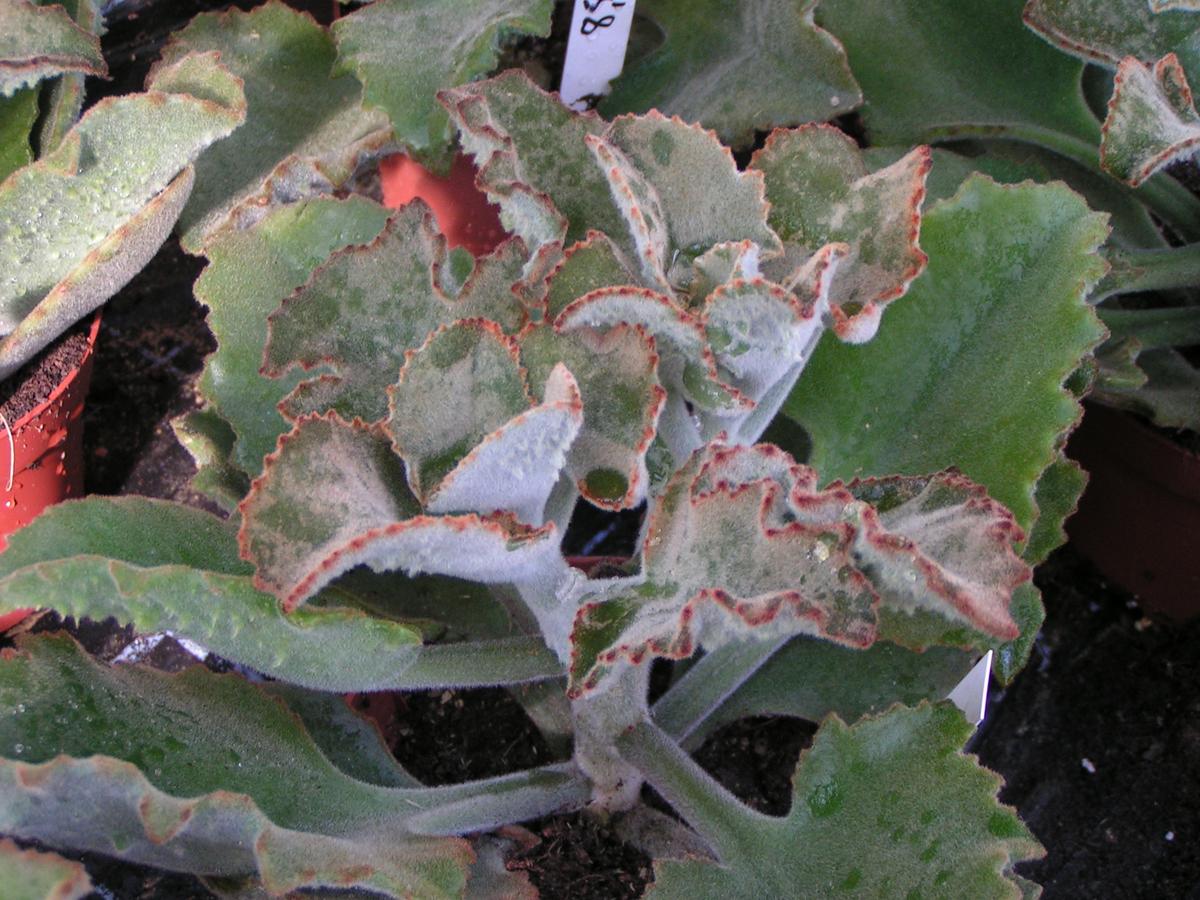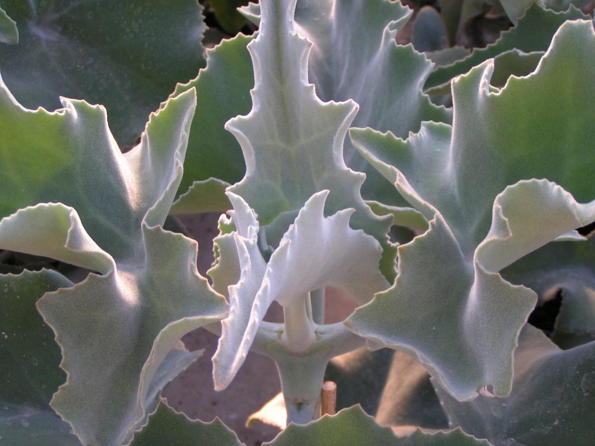 Diese Art hat einen mehr buschigen Wuchs und bleibt mit bis zu 50 cm (max. 80 cm) relativ kompakt. Ihre Blätter sind länglich-schmal (max. 6 cm lang) und beidseitig samtig-filzig, silbergrau und haben am leicht gezahnten Rand bronzefarbene Tupfen. Auch hier ist ein Rückschnitt gut möglich. Vermehrung wie bei K. beharensis beschrieben.