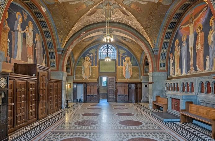 Nach der Wiederbesiedlung der Abtei durch Mönche der Abtei Beuron anno 1892 wurden viele Gebäude neu gestaltet, so auch die Sakristei im Sinne der Beuroner Kunst.