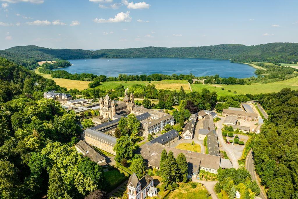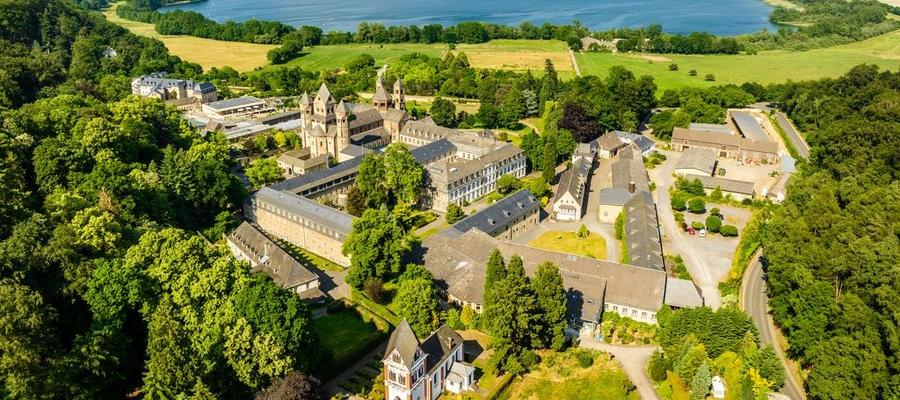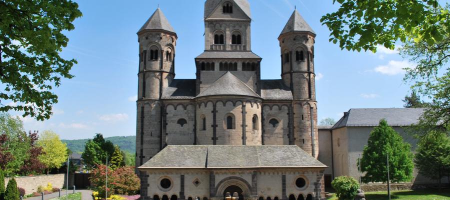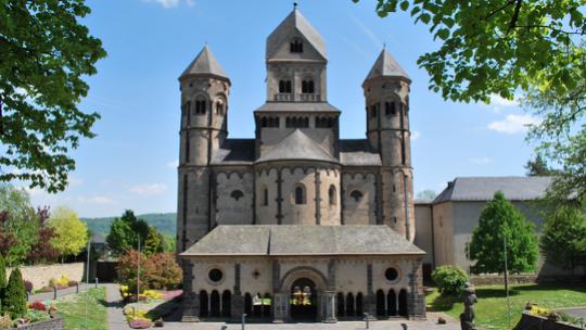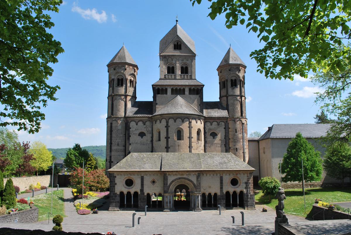 Die dreischiffige, doppelchörige Pfeilerbasilika mit zwei Querhäusern und sechs Türmen ist das Herzstück der Klosteranlage Maria Laach. Sie gilt als eines der schönsten und besterhaltenen romanischen Baudenkmäler unseres Landes in der Tradition der großen rheinischen, romanischen Dome in Speyer, Mainz und Worms. Die Kirche ist erbaut aus regionalen Tuffen, schwarzgrauen Basaltlaven, Sandsteinen und verschiedenartigen Kalksteinen. Zu den Besonderheiten zählen die Krypta unter dem Ostchor, die in der sog. Beuroner Kunst ausgemalte Sakristei und die Vorhalle, das sogenannte „Paradies“. Die im Zuge der Säkularisation von 1803 vollständig ausgeräumte Basilika wurde nach der Wiederbesiedlung 1892 durch aus dem Kloster Beuron kommende Benediktinermönche und großzügige Freunde und Gönner der Abtei in den heutigen wunderbaren und kunstvollen Zustand gebracht. Eine Führung bietet umfassende Informationen und Einblicke in die einstige Klosterkirche und präsentiert die heutige in ihrer vielfältigen und bemerkenswerten Schönheit.