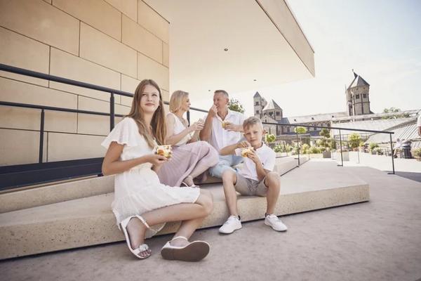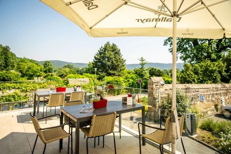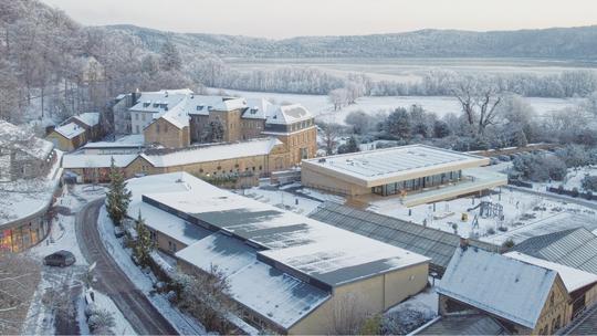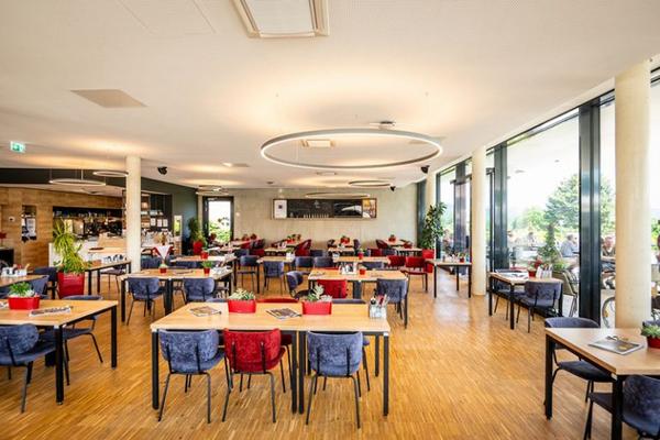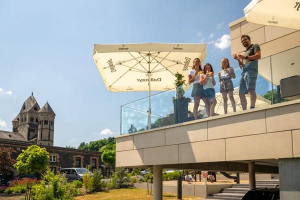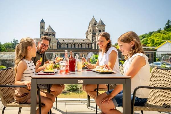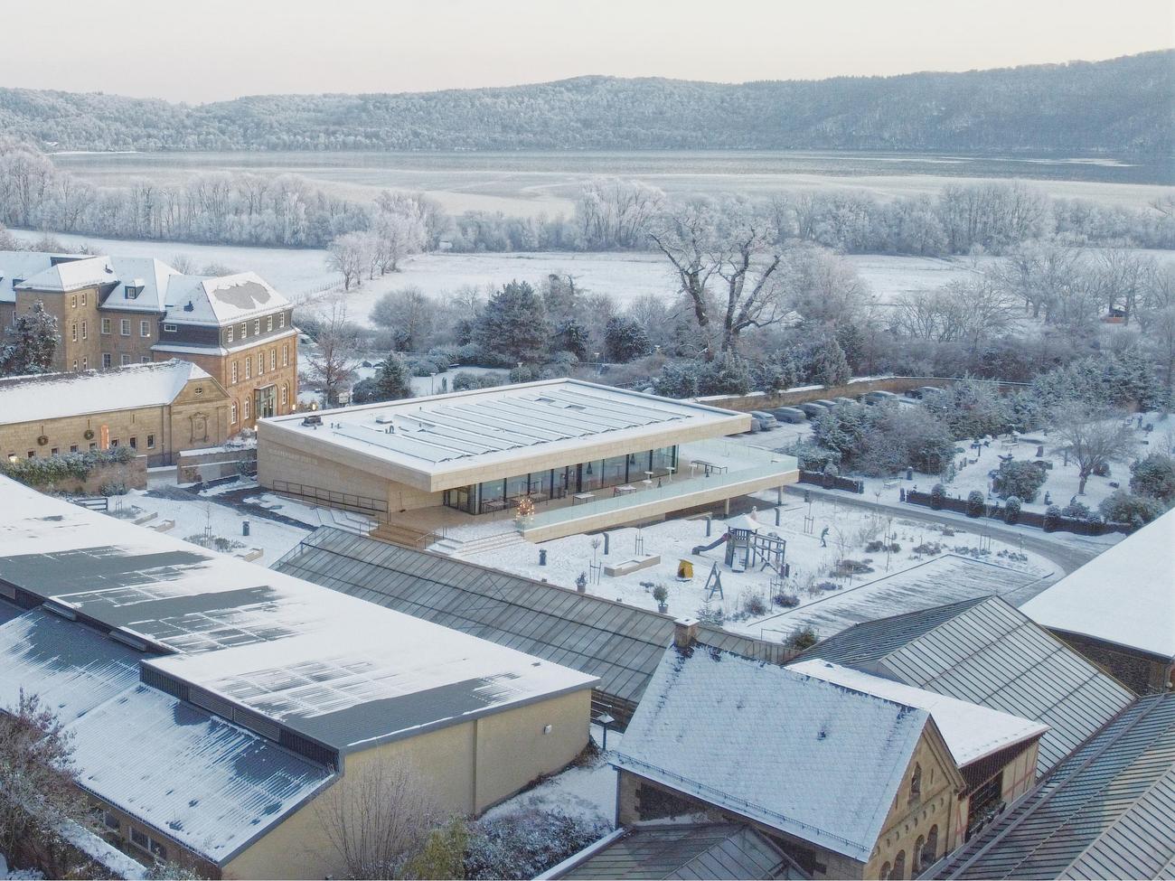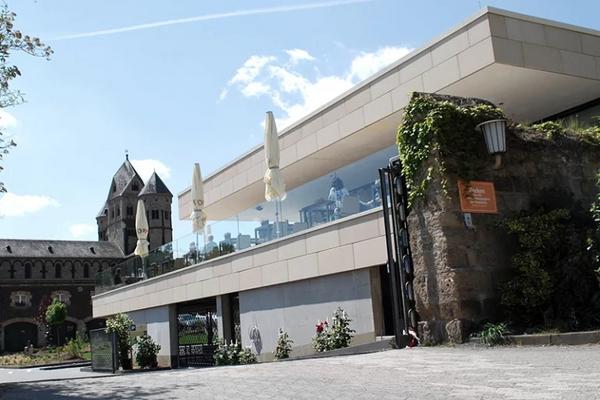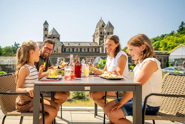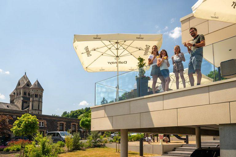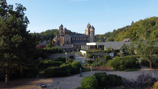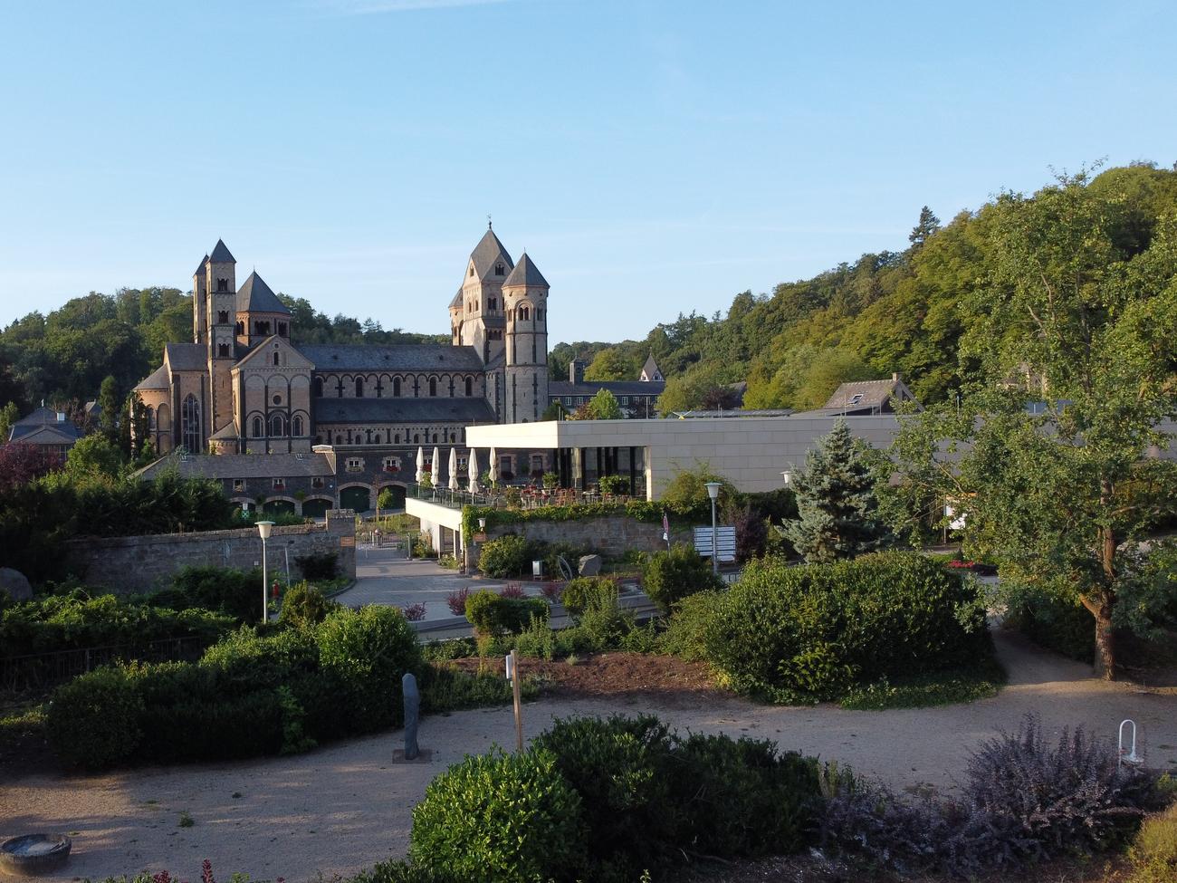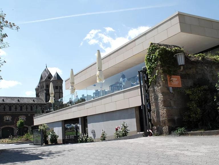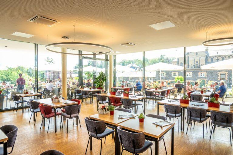 Von der neuen Klostergaststätte haben unsere Gäste sowohl vom Innenbereich als auch von der Terrasse einen direkten Blick auf die Abteikirche und in das Laacher Seetal.