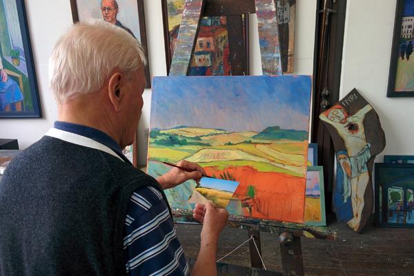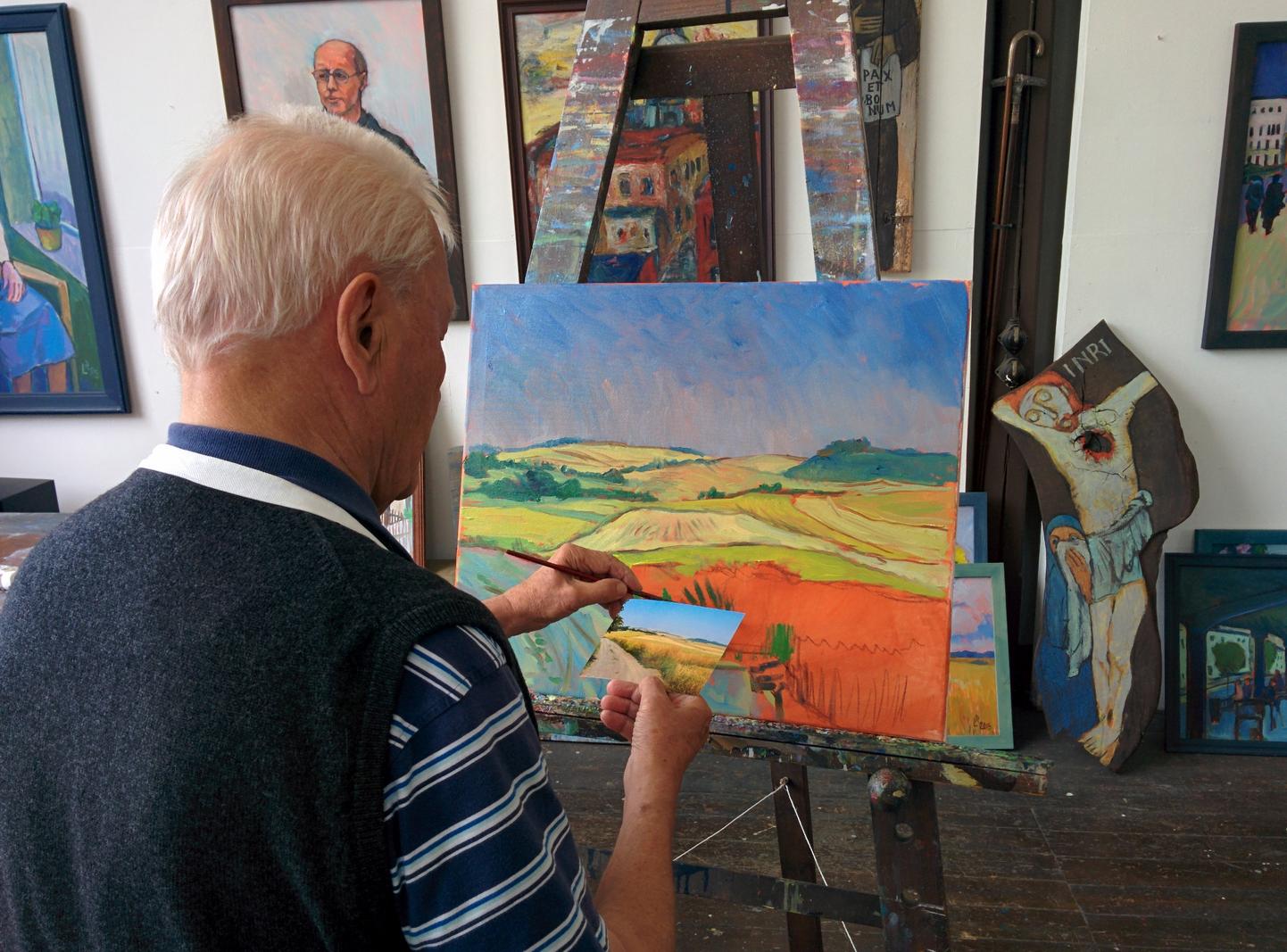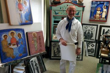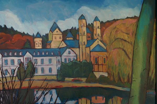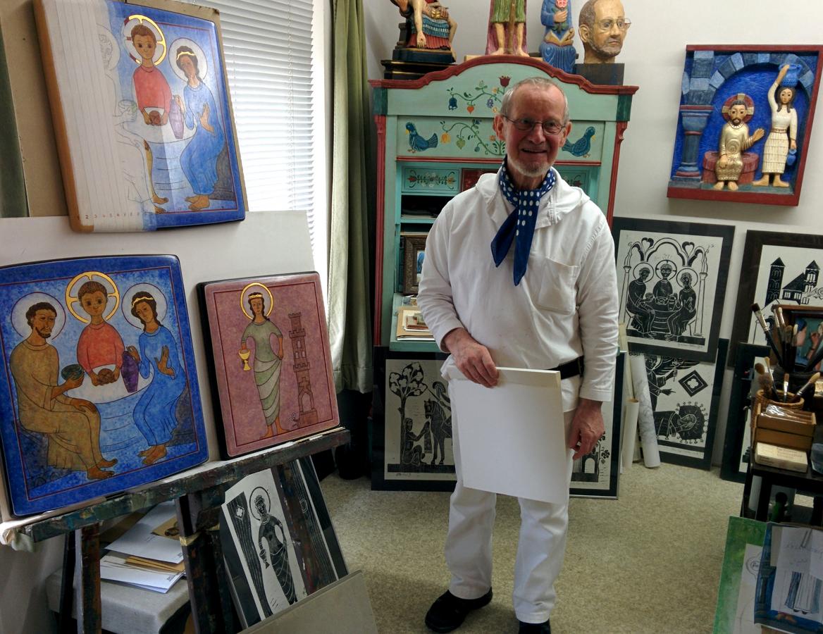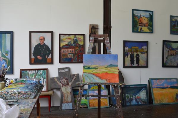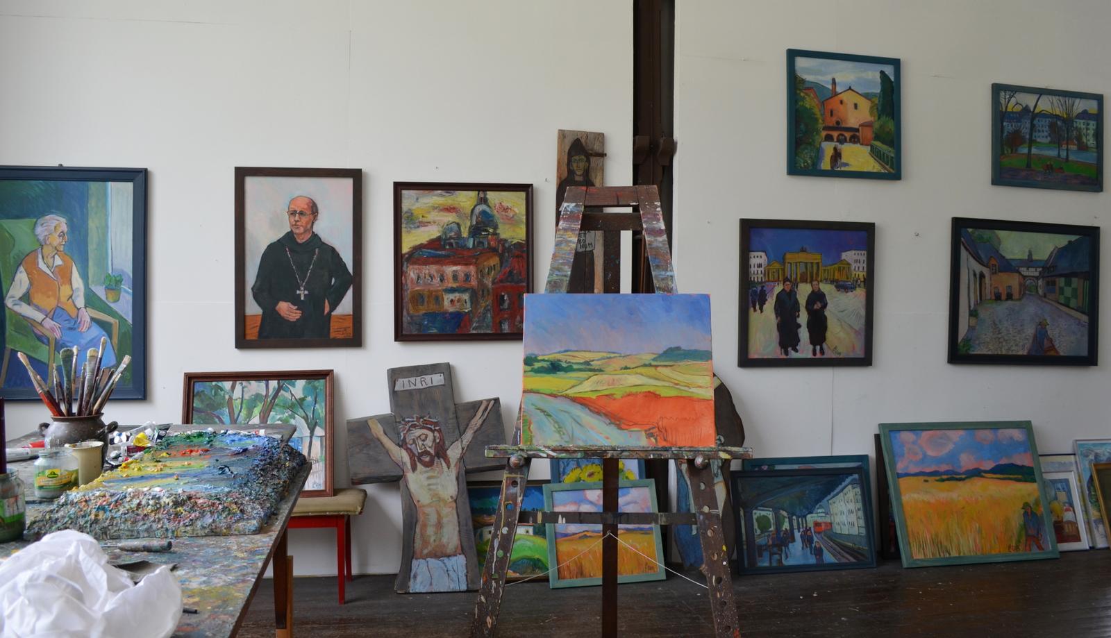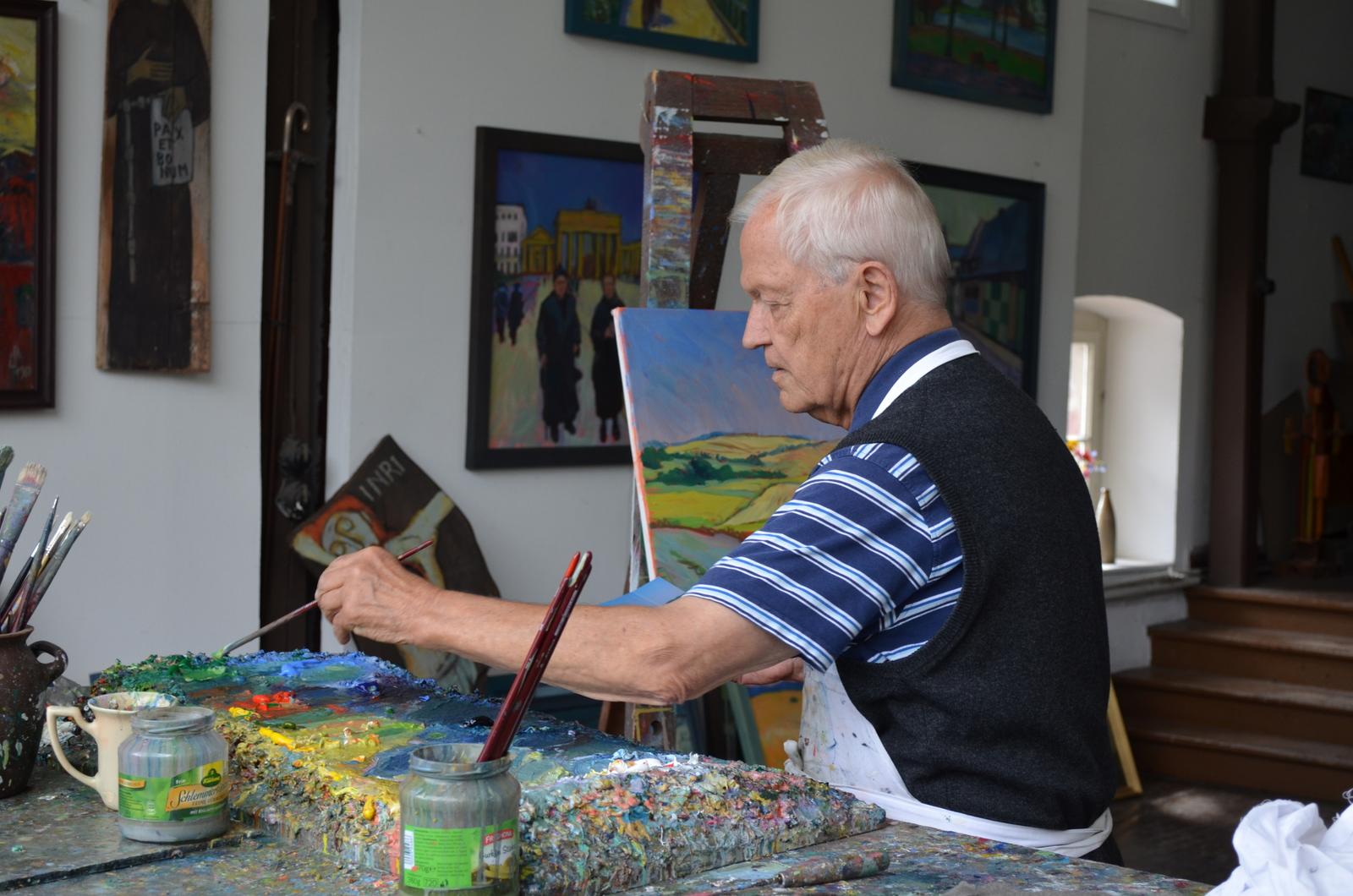 In seinem Atelier hier im Kloster sind in den letzten Jahrzehnten zahlreiche Ölgemälde, Kreuze und Plakate entstanden. In vielen Klosterbereichen, wie z. B. im Gastflügel, finden sich seine Bilder, geprägt von seinem Studium der expressionistischen Malerei.
