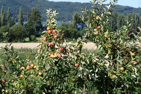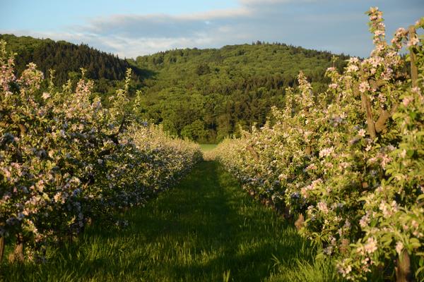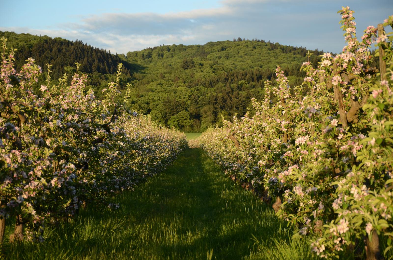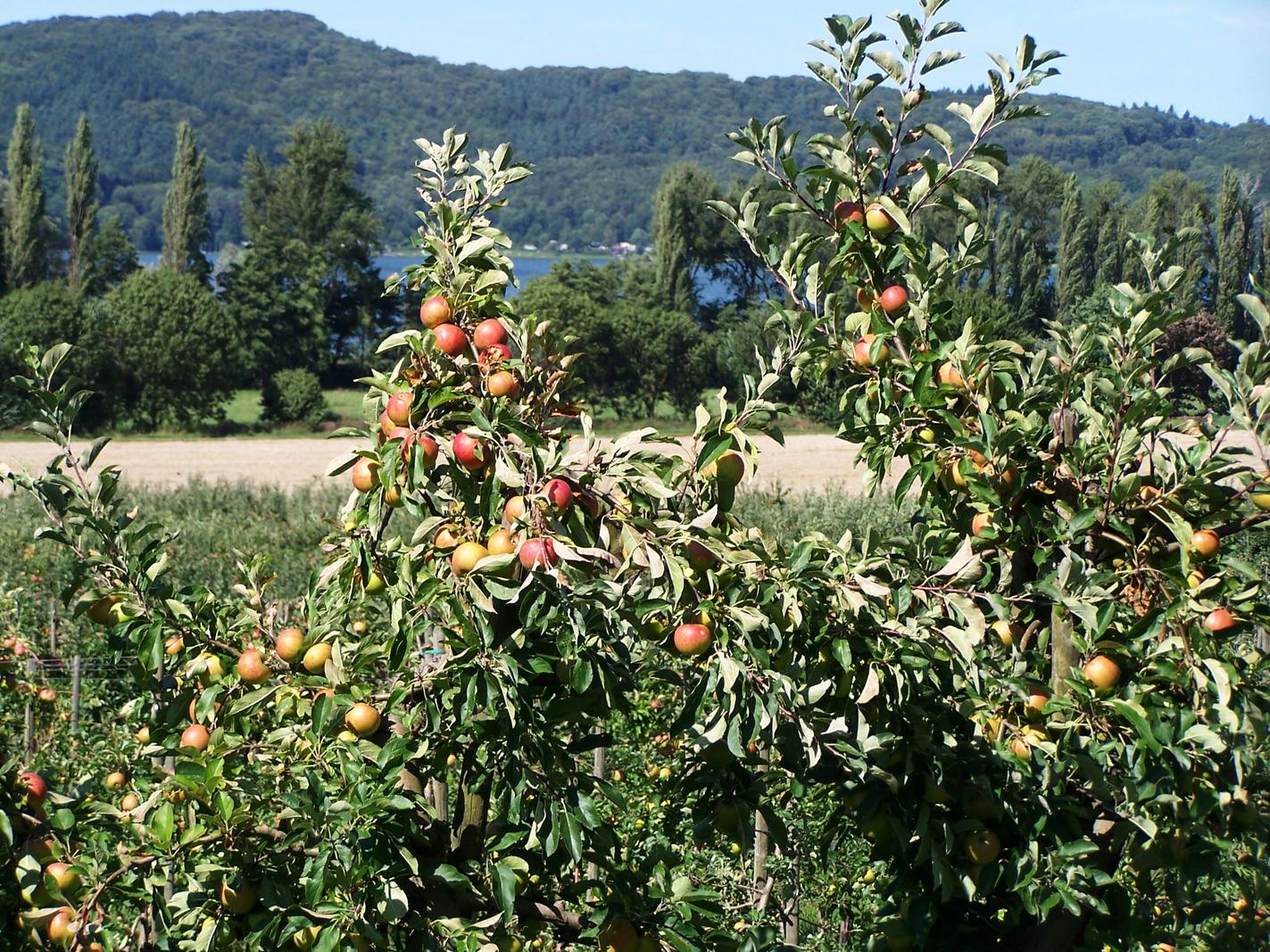 Mitten im Naturschutzgebiet am Laacher See betreiben wir Obstanbau. Rosen und Buchsbaum, Sonnenblumen und Wacholder sind zwar nicht essbar, tragen aber wunderbar zum Gartencharakter unserer Obstanlage bei. Natürlich vorkommende Wildkräuter umsäumen die 65.000 qm große Fläche mit ca. 10.000 Obstbäumen.