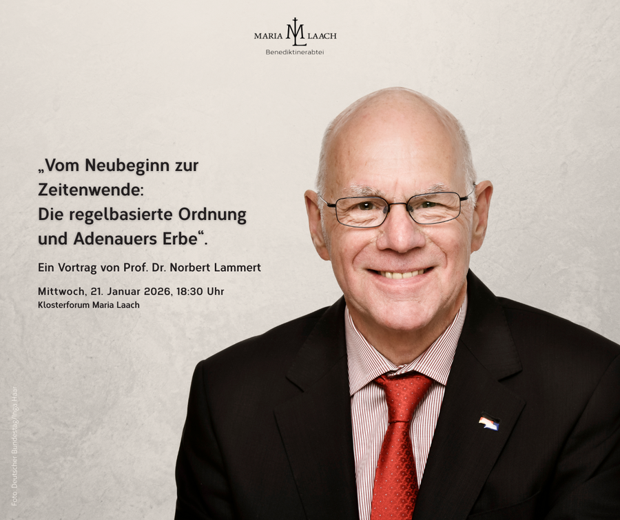 Am Mittwoch, 21. Januar 2026, war Norbert Lammert, Präsident des Deutschen Bundestages a. D. und Ehrenvorsitzender der Konrad-Adenauer-Stiftung, zu Gast in der Abtei Maria Laach. Im Klosterforum sprach er zum Thema „Vom Neubeginn zur Zeitenwende: Die regelbasierte Ordnung und Adenauers Erbe“.