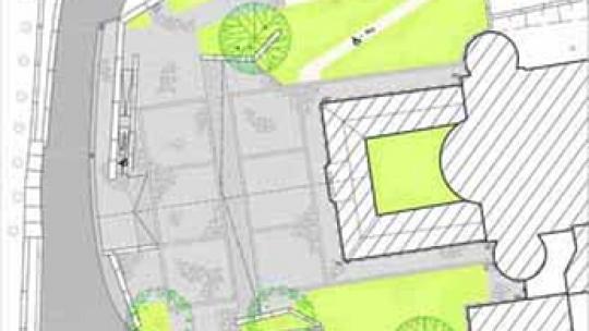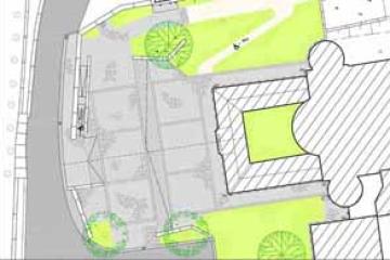 Mit der Neugestaltung des Kirchenvorplatzes konnte bereits 2005 das erste große Projekt in Angriff genommen werden. Vor 50 Jahren war der Gehweg des Platzes mit Basaltplatten ausgelegt, zum größten Teil jedoch mit einer Lavaschüttung versehen worden, die inzwischen ihr ungutes Werk getan hatte: Die unter dem Platz führende Abwasserleitung hatte sich völlig zugesetzt, und der von dem Lavabelag verursachte Staubeintrag hatte in der Kirche zu größeren Schäden geführt. Im Zuge der nun durchgeführten Maßnahmen wurden die Abwasserleitungen erneuert, eine ansprechende Gesamtgestaltung vorgenommen, eine in den Laacher Klosterbetrieben hergestellte Beleuchtungsanlage installiert, eine großzügige Treppenanlage mit einem behindertengerechten Zugang zur Kirche angelegt, eine neue Toilettenanlage für Kirchenbesucher und Touristen geschaffen, die Klosterpforte saniert und die vor den Fenstern des Klosters angebrachten Gitter beseitigt. Abt Benedikt damals: „Wir leben doch in einem Kloster und nicht in einem Gefängnis.“