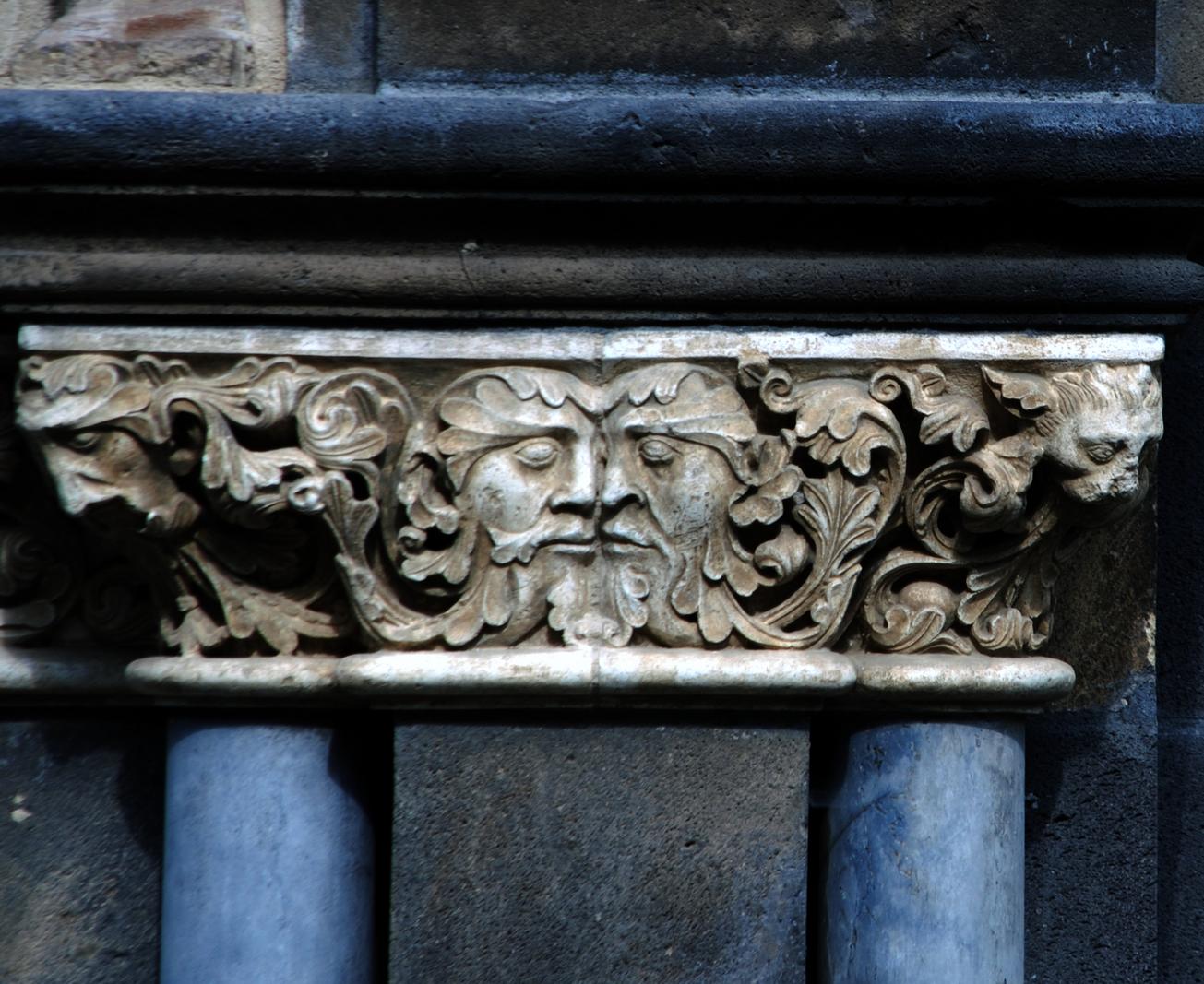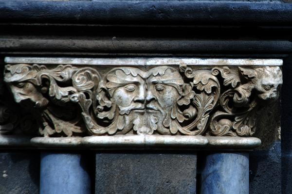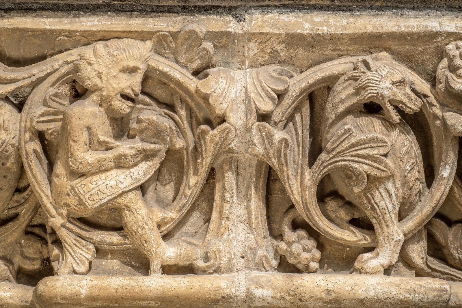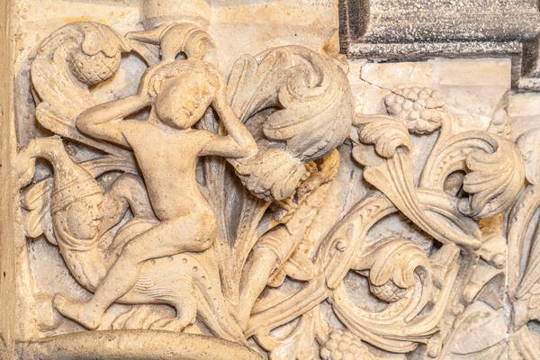 An den Arkaden finden sich wunderschöne feingliedrige Kapitellplastiken, die alte Menschheitsmotive von Kampf und Streit, Neid und Missgunst zeigen, zum Beispiel die sogenannten Haarraufer. Am äußeren Westportal notiert das sogenannte „Laacher Teufelchen“ die Sünden des Volkes auf einem Pergament. All diese Darstellungen sollen den Eintretenden dazu auffordern, sich selbst zu erkennen, sich vom Ballast der Sünde zu befreien und quasi geläutert in die Kirche zu gehen.