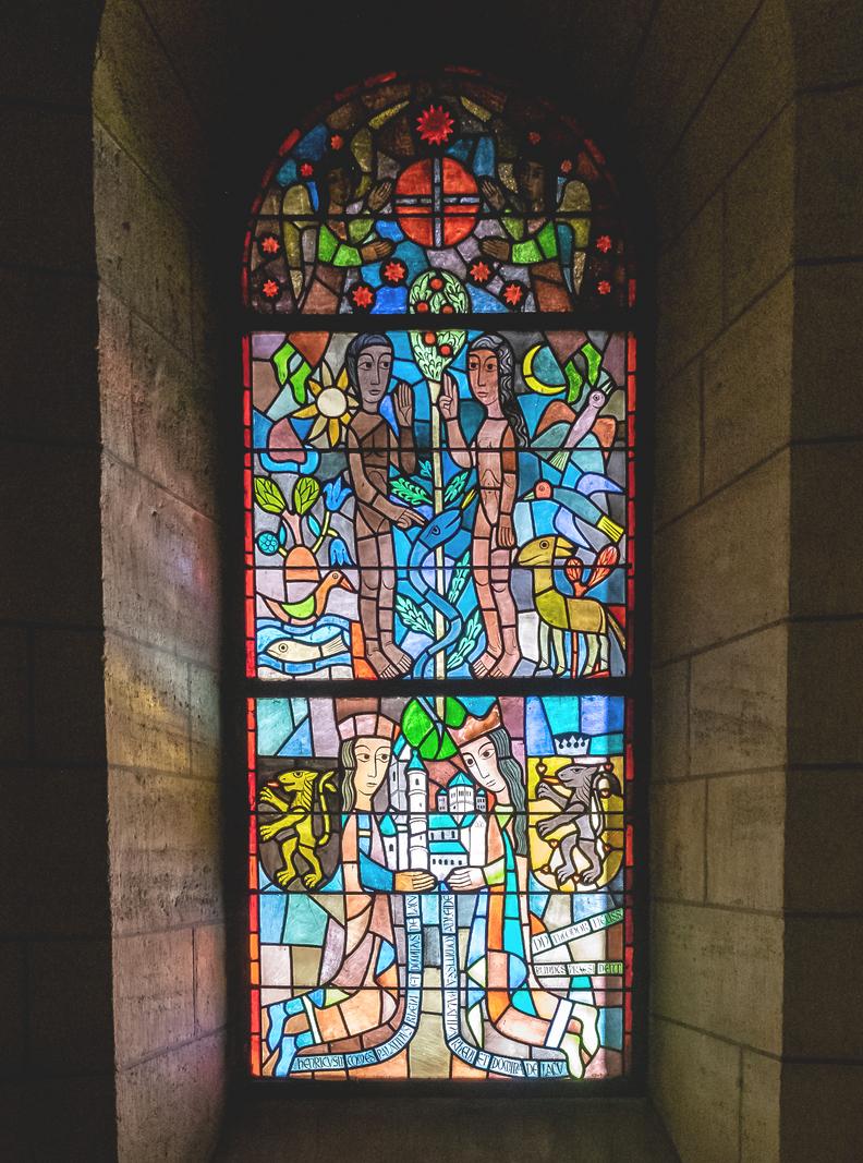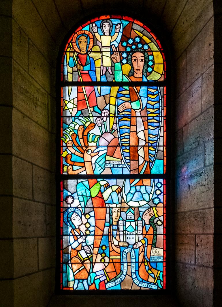 Die drei farbigen Fenster der Westapsis, entworfen von Professor Wilhelm Rupprecht, zeigen die Heilsszenen des Alten und Neuen Bundes. Der von der Westapsis umschlossene Raum war früher der Platz für die Stifterfamilie des Pfalzgrafen. Die Fenster wurden deshalb gestiftet von Bundespräsident Theodor Heuß (1884-1963), von Bundeskanzler Dr. Konrad Adenauer (1876-1967) und vom Ministerpräsidenten des Landes Rheinland-Pfalz Peter Altmeier (1899-1977).