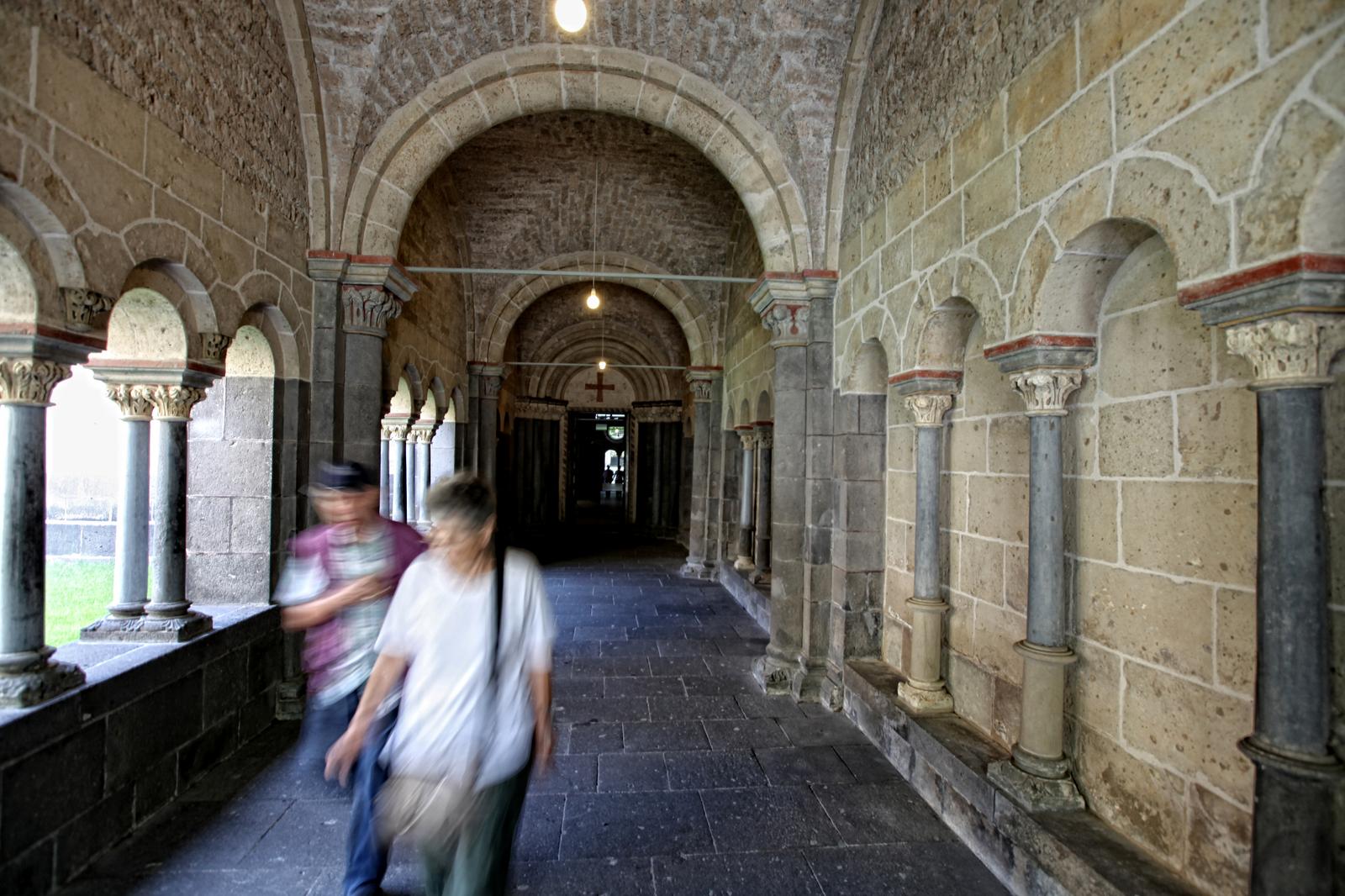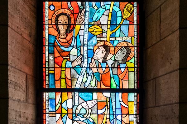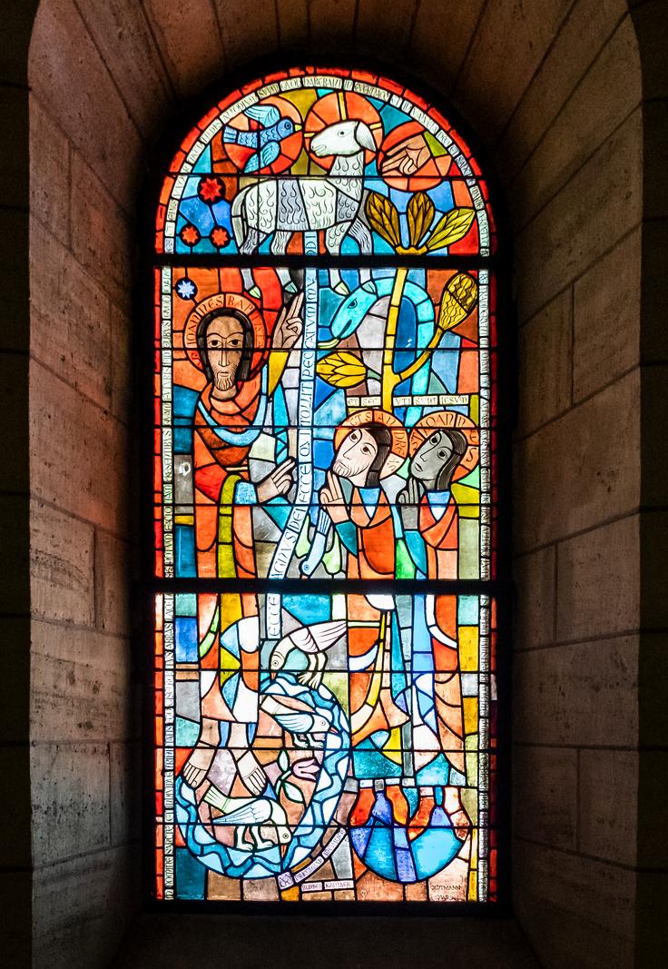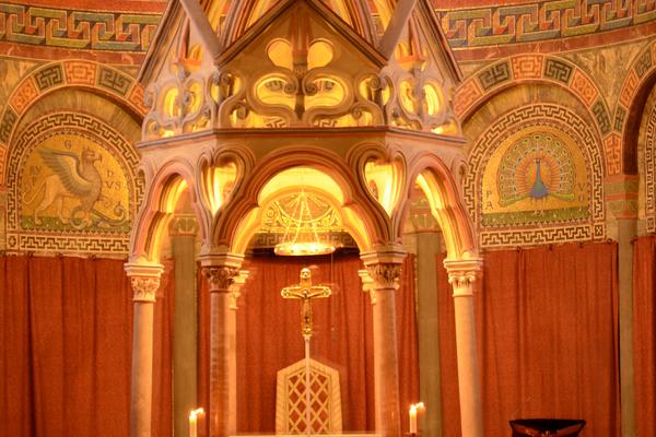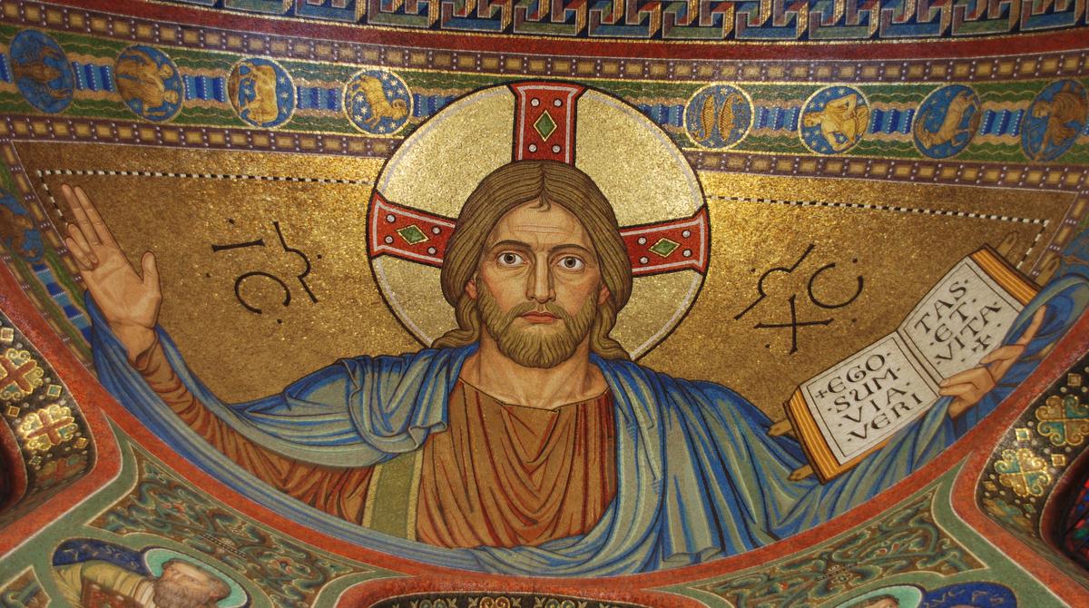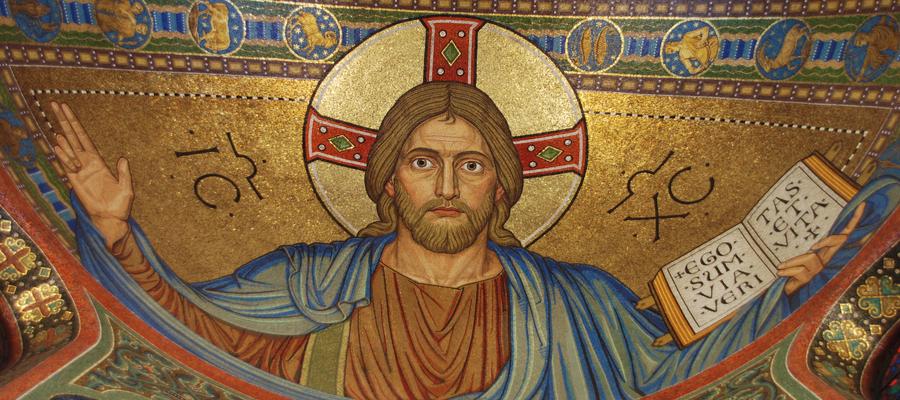 Beim Betreten der Kirche wird der Blick angezogen von dem großen Mosaikbild im Chorraum in der Ostapsis. Es zeigt Christus, den Welterlöser, der über allem thront und in seiner Linken das aufgeschlagene Buch mit den Worten aus Johannes 14,6 hält. Hier versammeln sich die Mönche zu den festgesetzten Gebetszeiten, um Gott das Lobopfer darzubringen, für den Frieden der Welt und das Heil der Menschen zu bitten.
