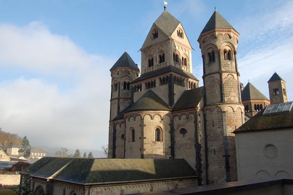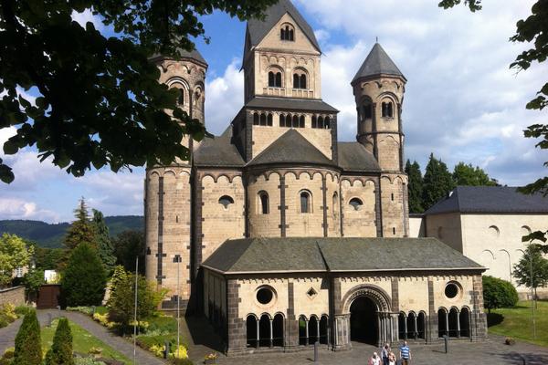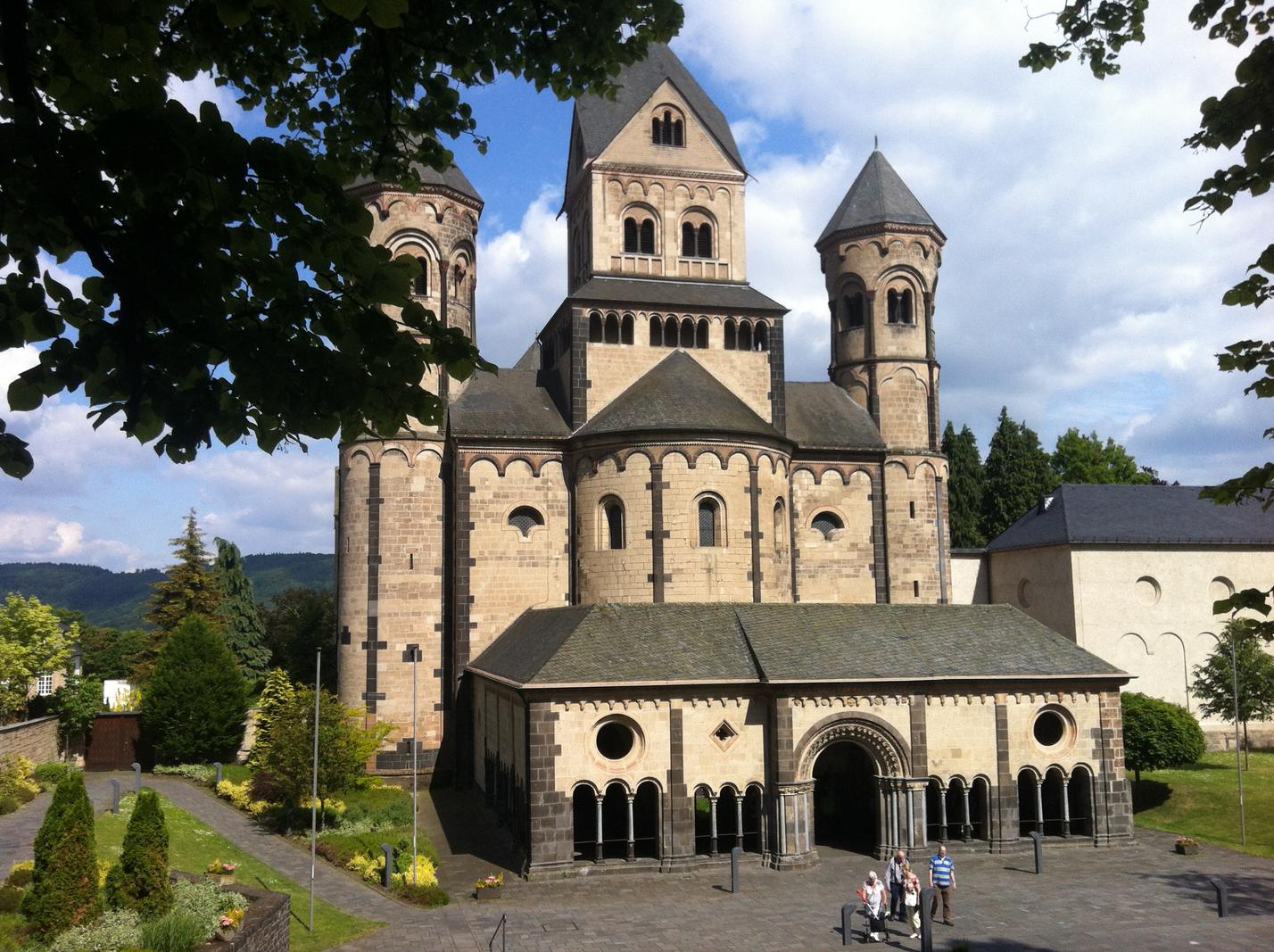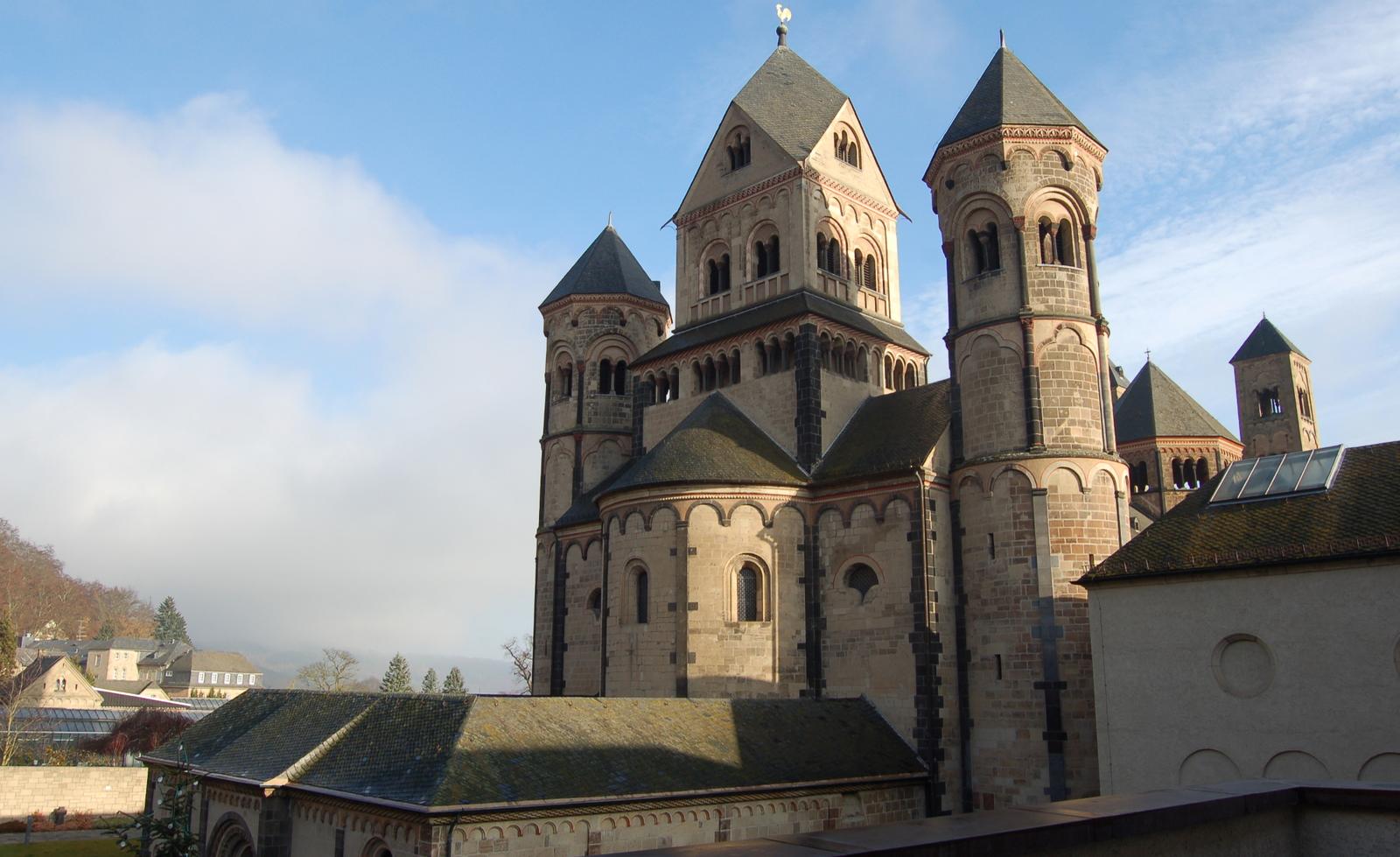 Die dreischiffige, doppelchörige Pfeilerbasilika mit zwei Querhäusern und sechs Türmen ist das Herzstück der Klosteranlage Maria Laach und gilt als eines der schönsten und besterhaltenen romanischen Baudenkmäler unseres Landes – in der Tradition der großen rheinischen, romanischen Dome in Speyer, Mainz und Worms. Die Kirche ist aus braun-gelbem Laacher Tuff, weißem Kalkstein aus Lothringen und rotem Kylls-Sandstein dekorativ erbaut. Später verwendete man auch grauen Tuff aus der Eifel und Basaltlava. Zu den Besonderheiten zählen die unterirdische Krypta und die Vorhalle, das sogenannte „Paradies“.
